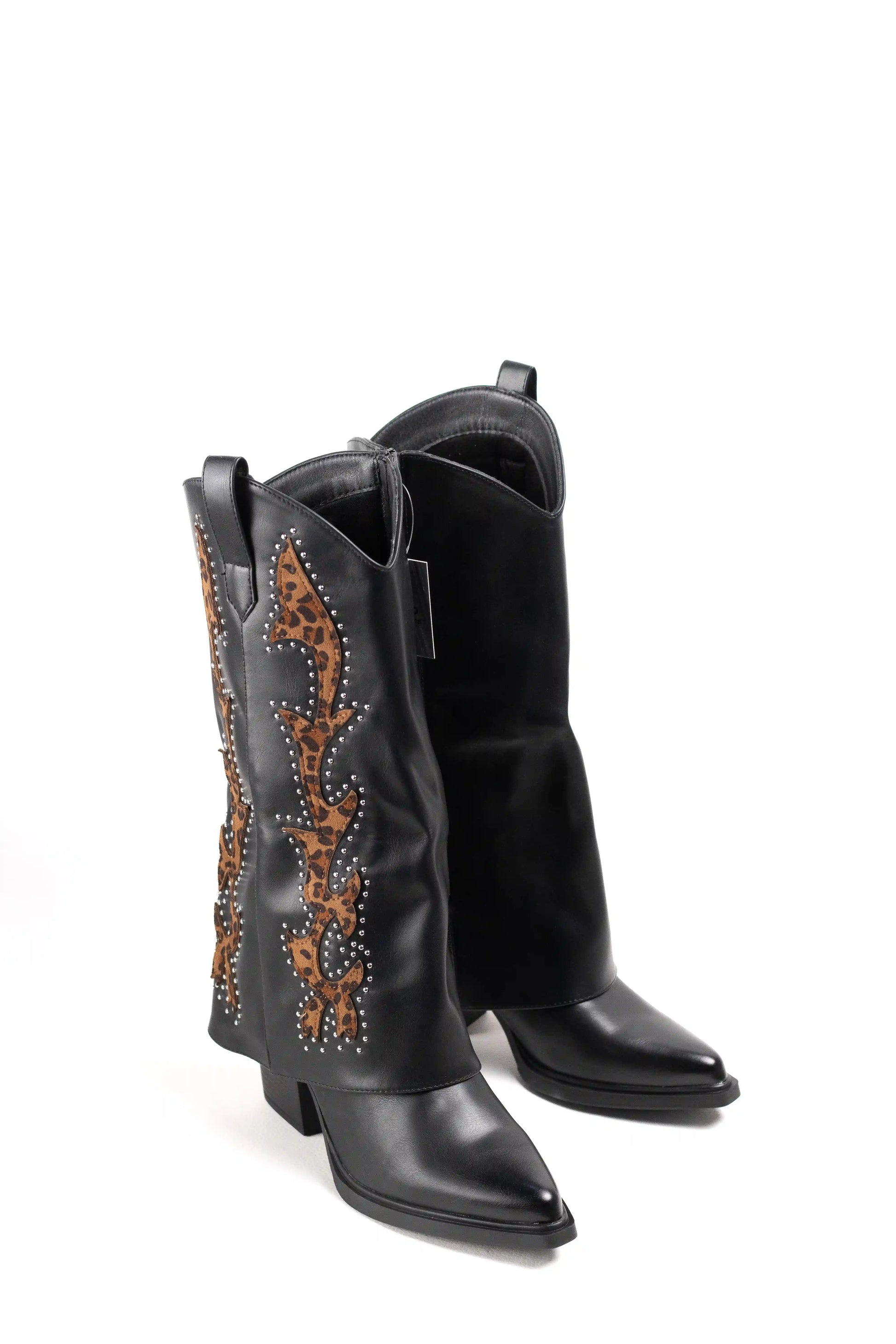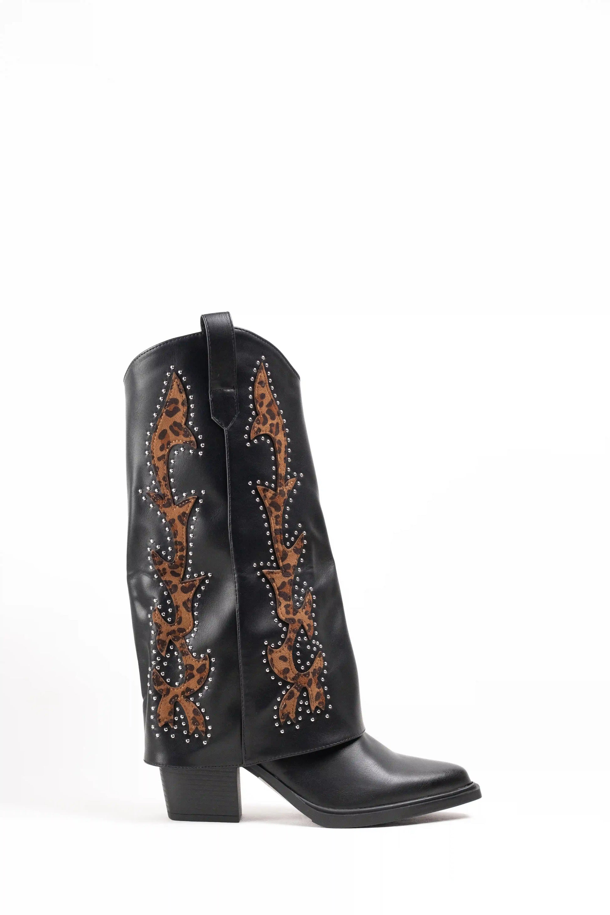 Botas cowboy mujer estilo pantalón negras con bordado animal print y tachuelas