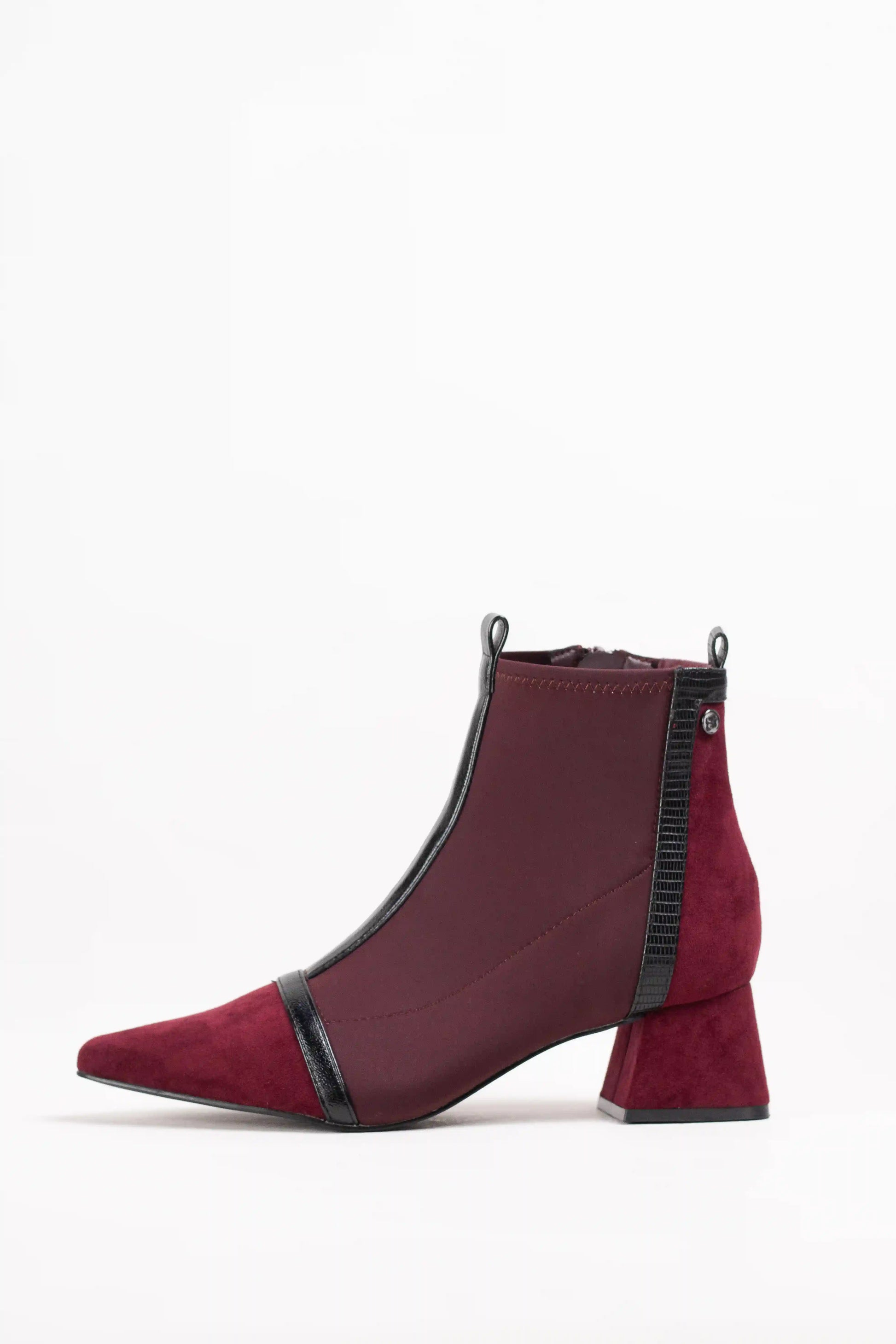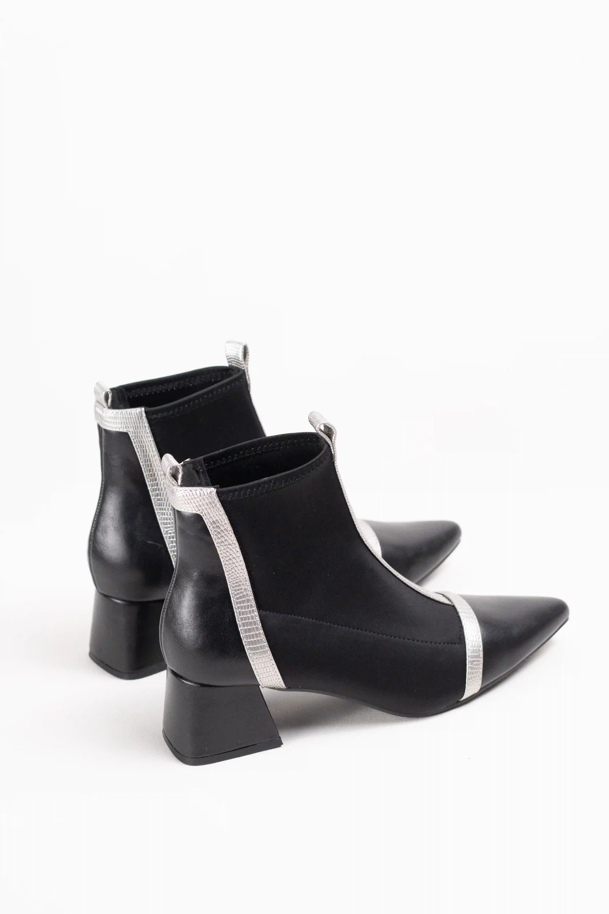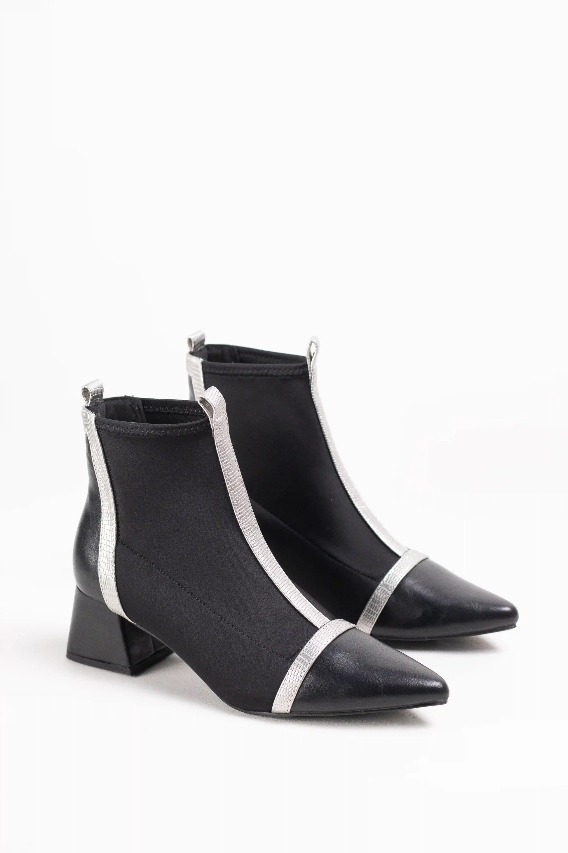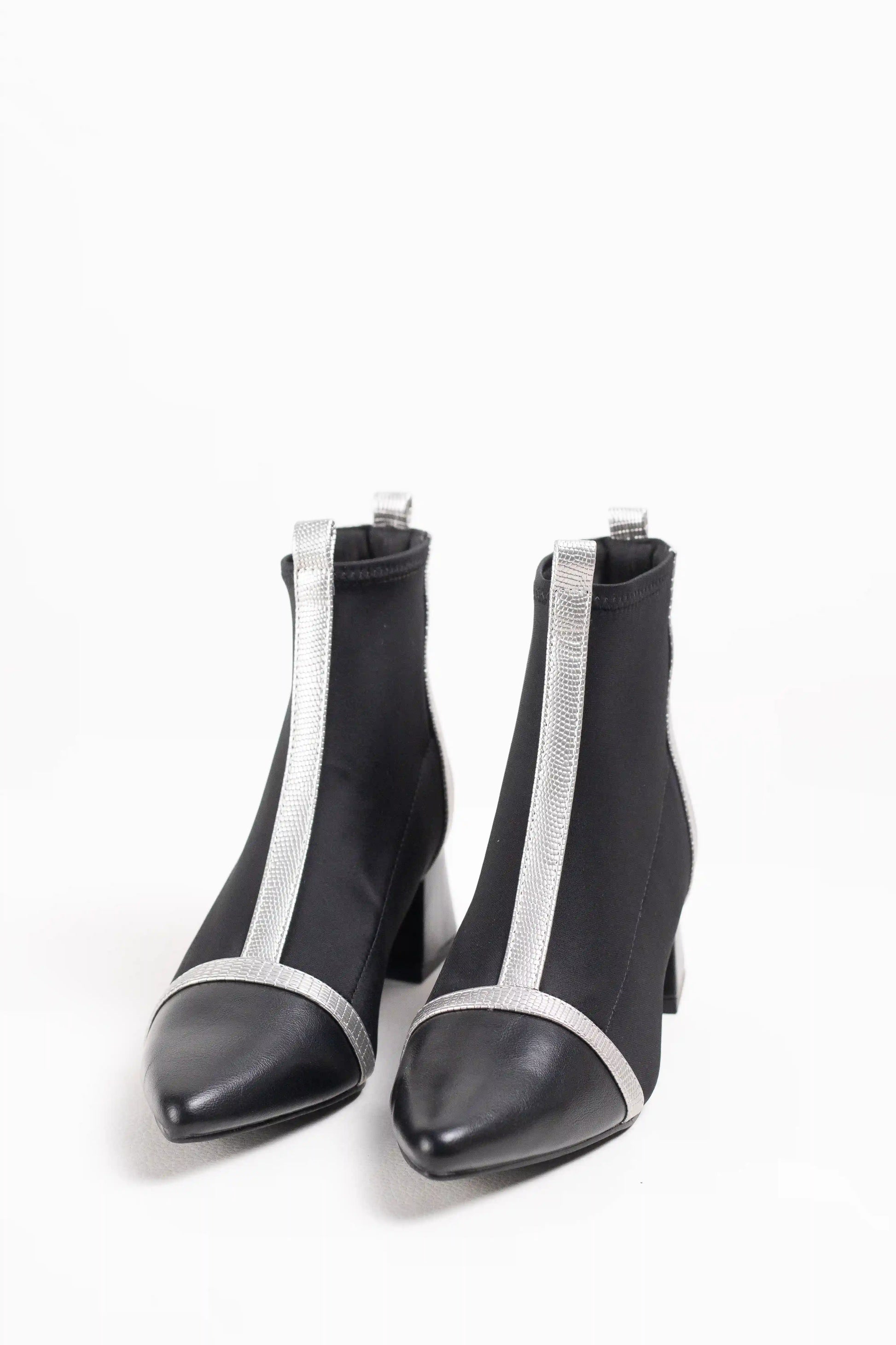 Botines de estilo moderno confeccionados en tejido elástico efecto calcetín, que se ajustan al pie aportando comodidad y elegancia. Destacan por su punta fina estilizada y el detalle de ribetes en contraste, que les da un aire sofisticado y actual.