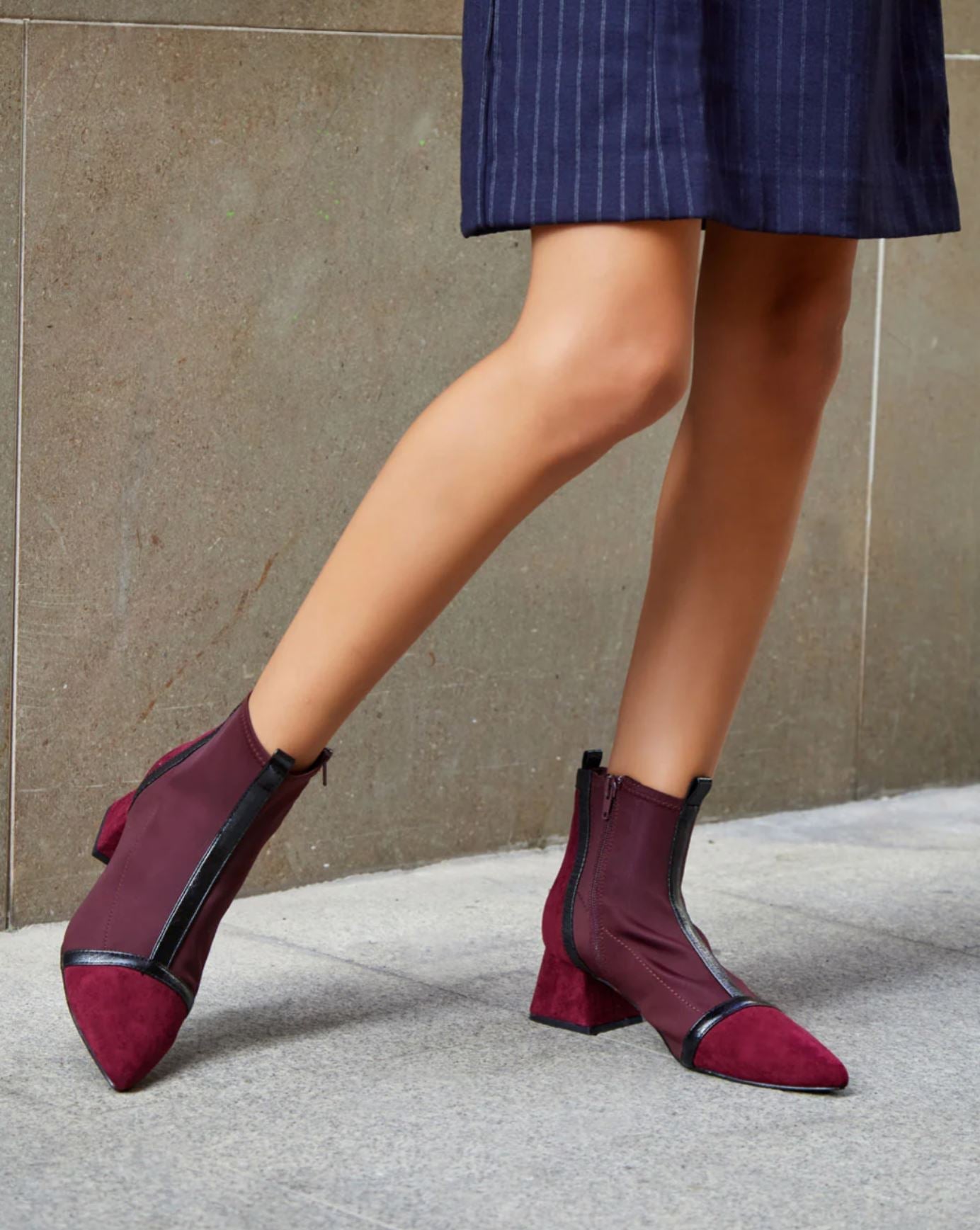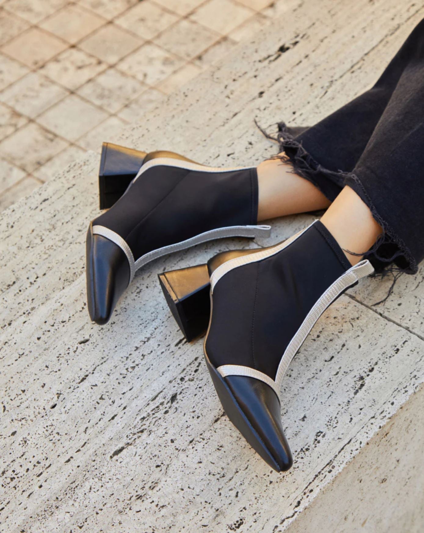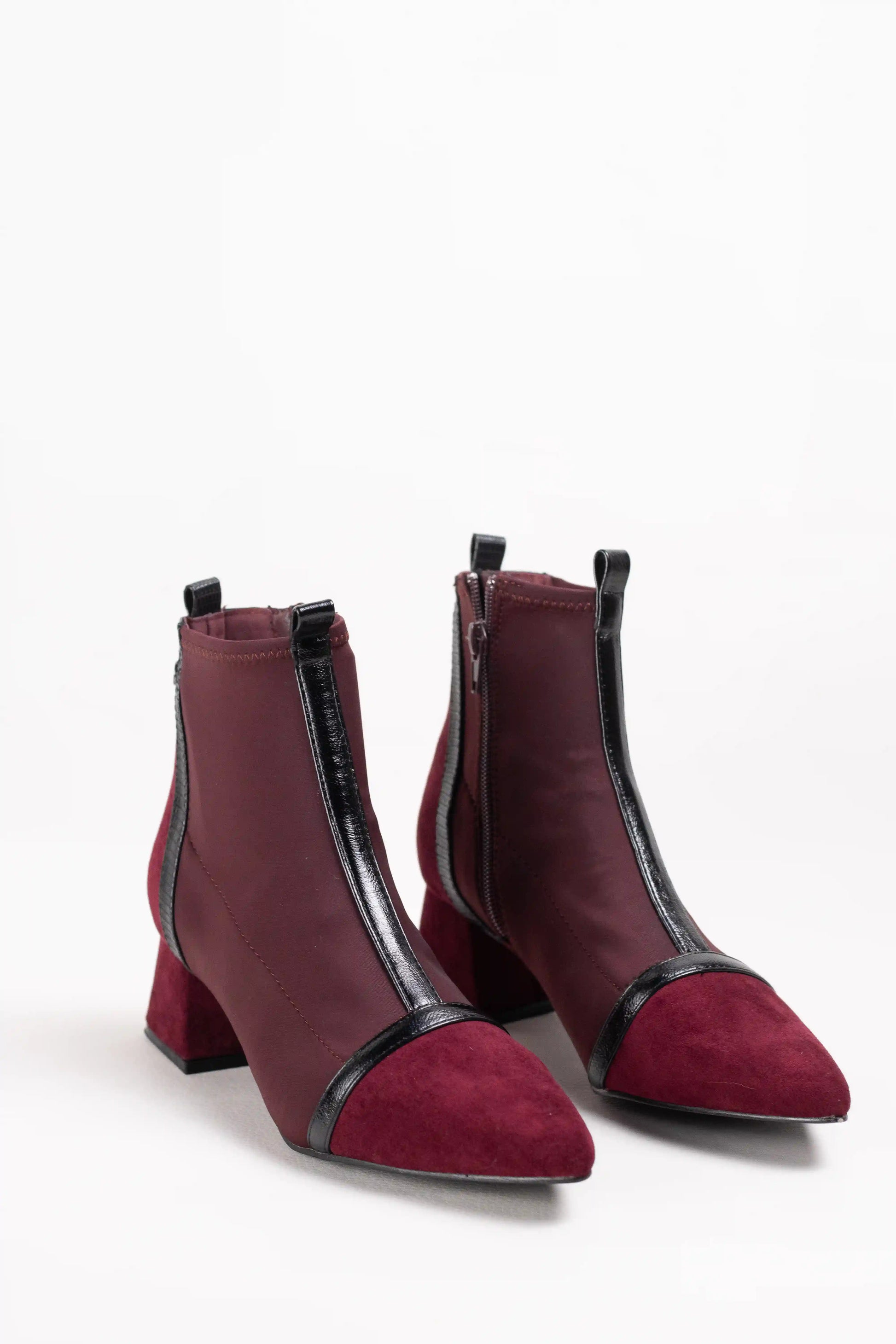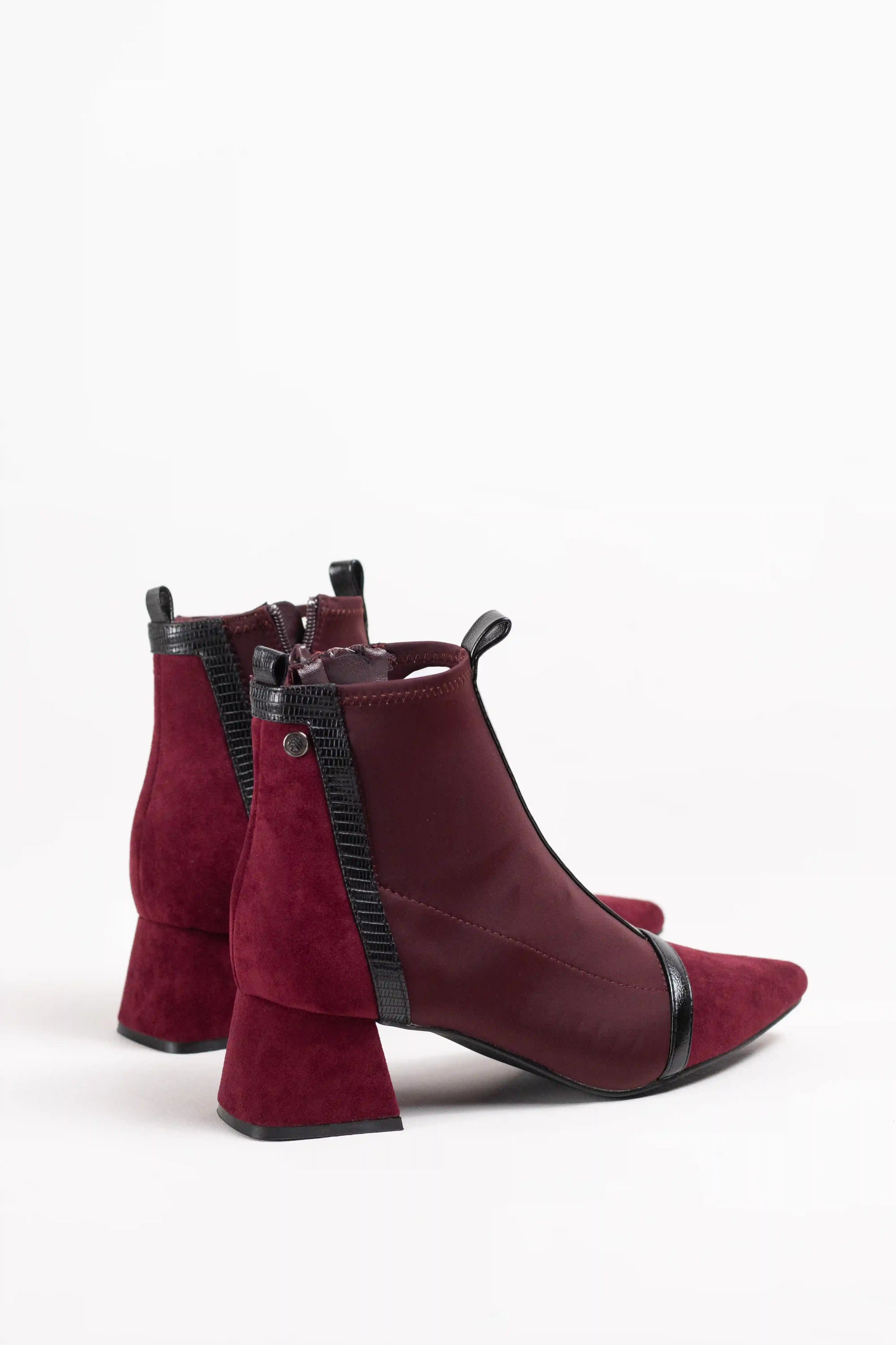 Botines de estilo moderno confeccionados en tejido elástico efecto calcetín, que se ajustan al pie aportando comodidad y elegancia. Destacan por su punta fina estilizada y el detalle de ribetes en contraste, que les da un aire sofisticado y actual.