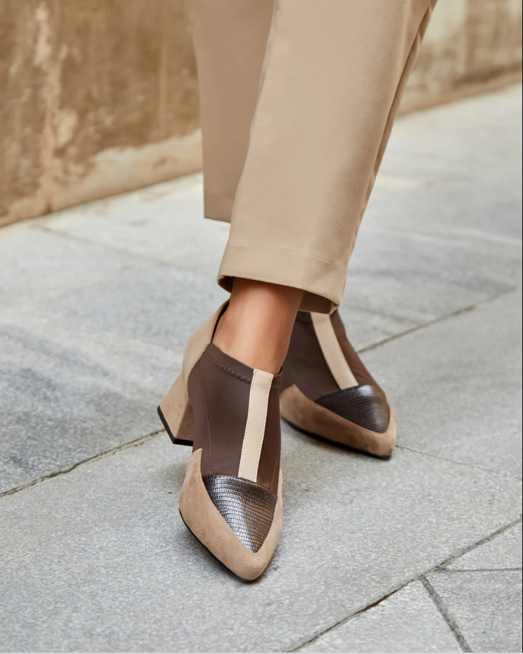 • Suela: El tacón de bloque robusto y de altura media ofrece estabilidad y confort durante todo el día, ideal para transiciones entre temporadas.