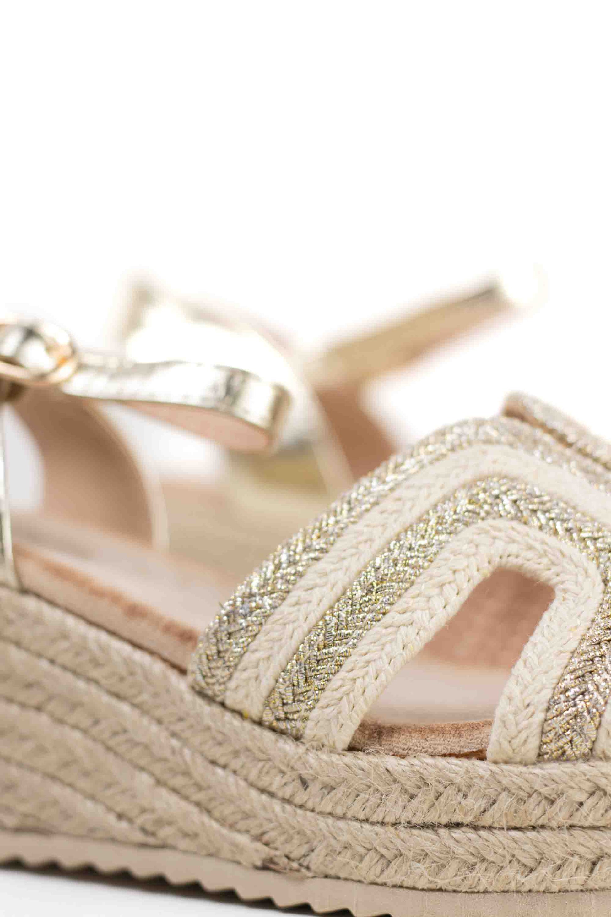 Sandalias doradas cuña de esparto y adorno de strass