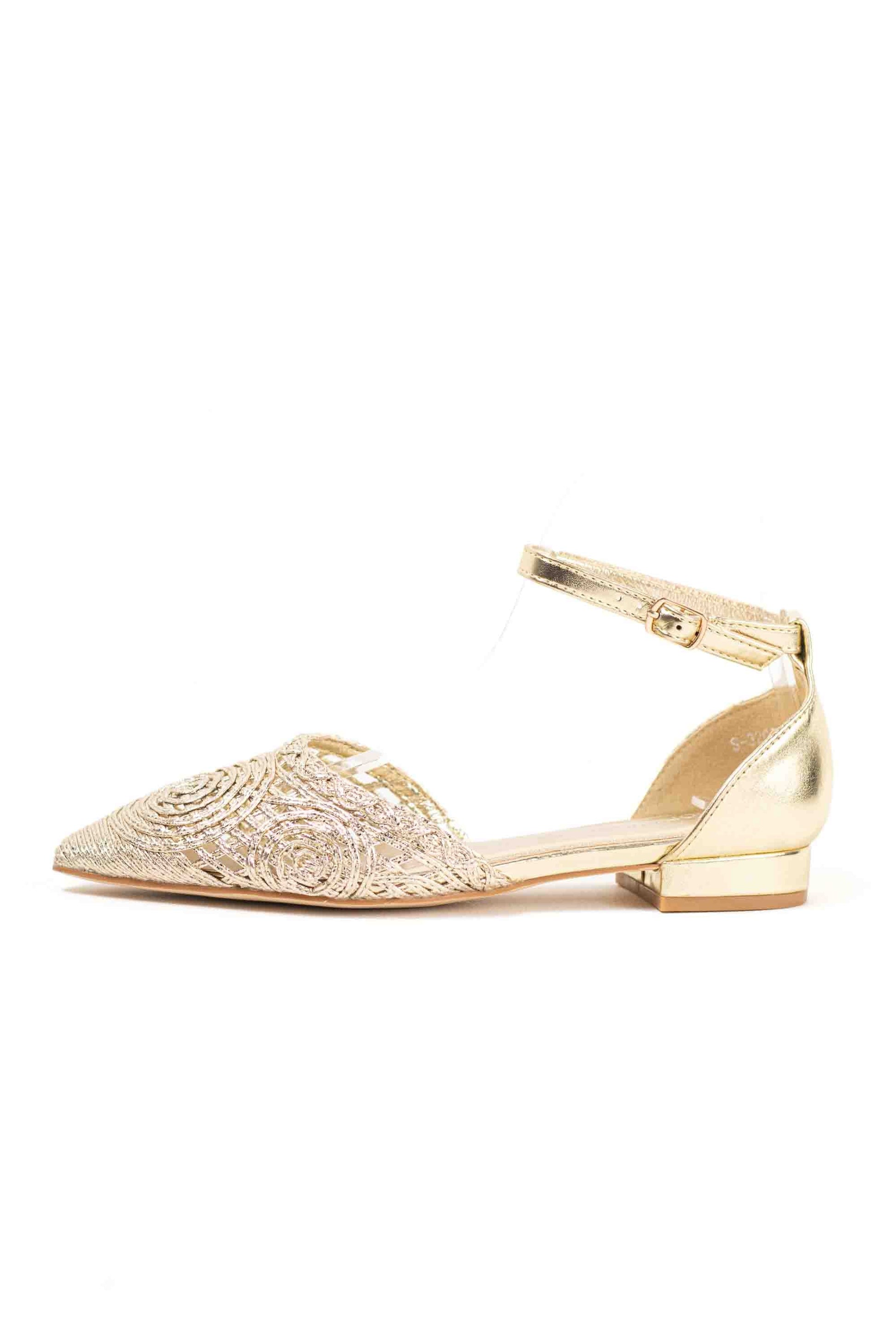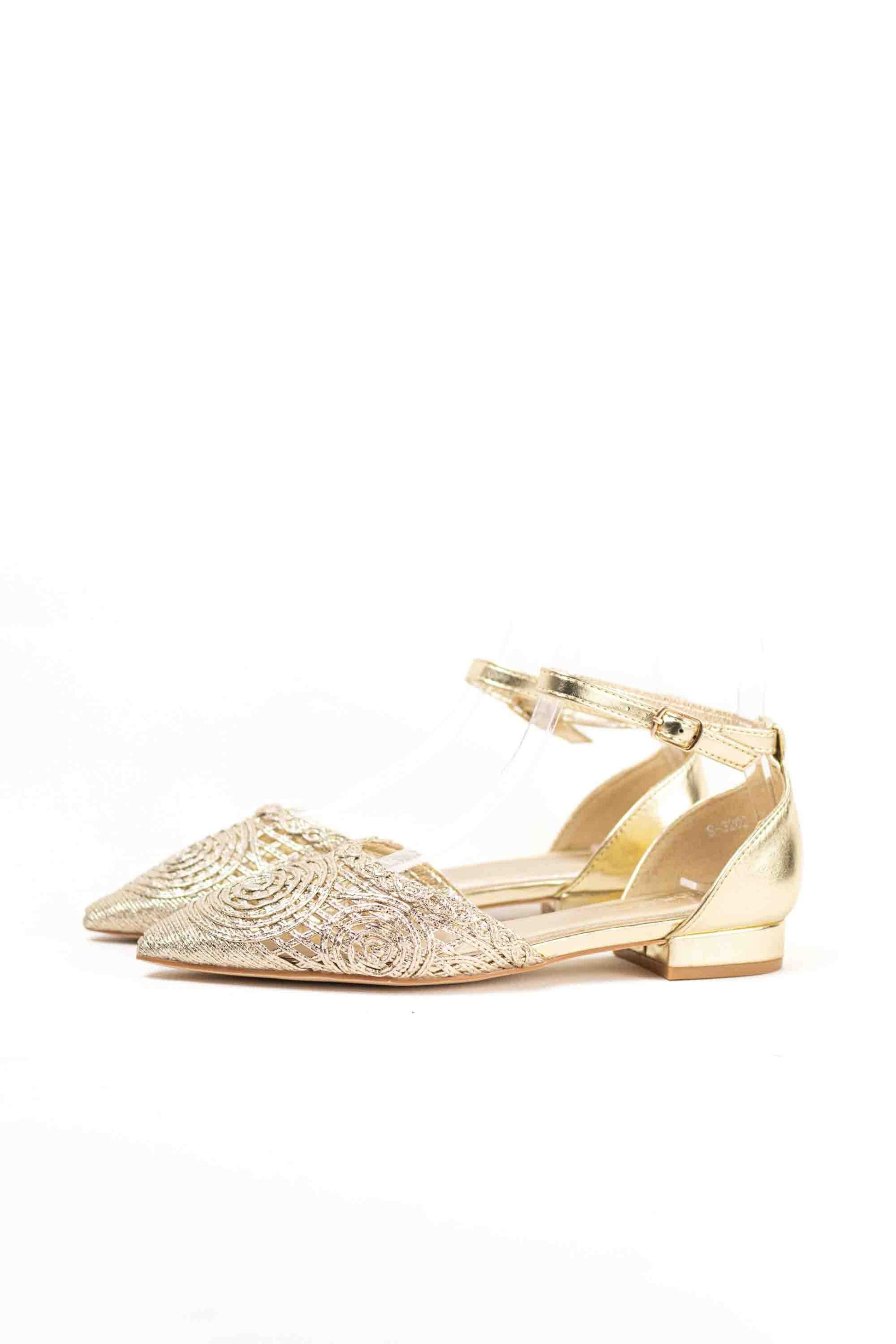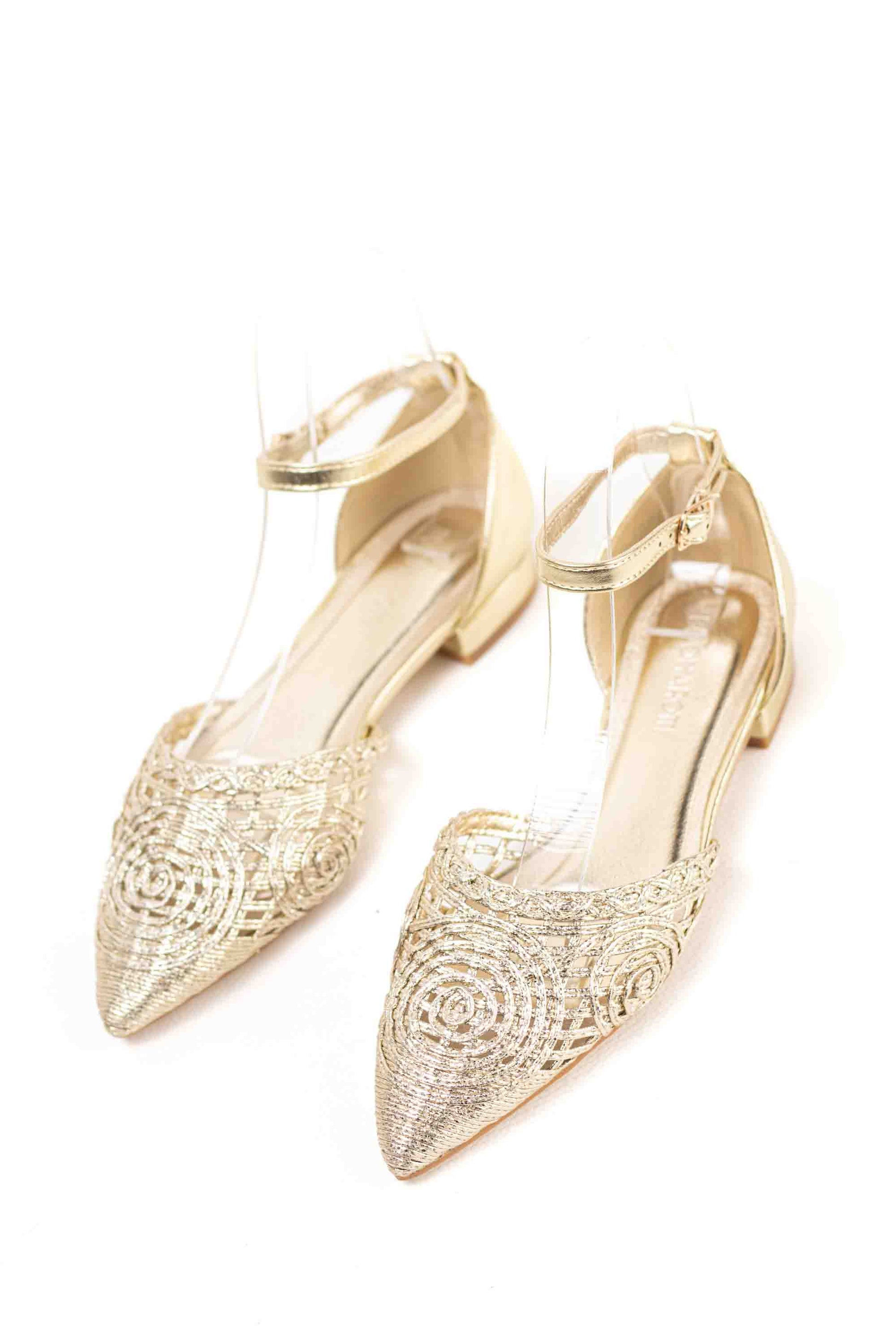 Zapatos dorados mujer con suela plana diseño crochet con pulsera